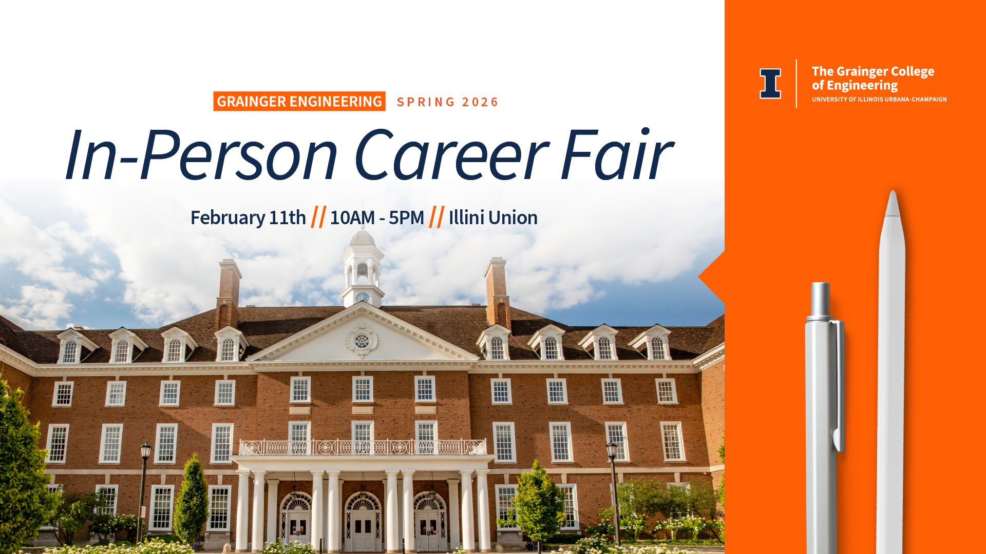 Companies will be looking for students to fill internships, co-ops, and full-time positions. Come prepared to make connections! February 11, 10am-5pm at the Illini Union.