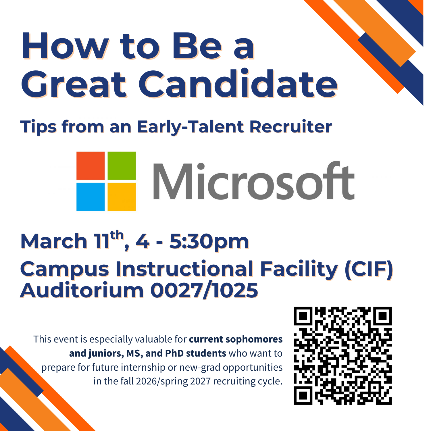 Want to stand out when applying to Microsoft? Join us on March 11 from 4-5:30pm at CIF 0027/1025 to hear from their Early-Talent Recruiter.