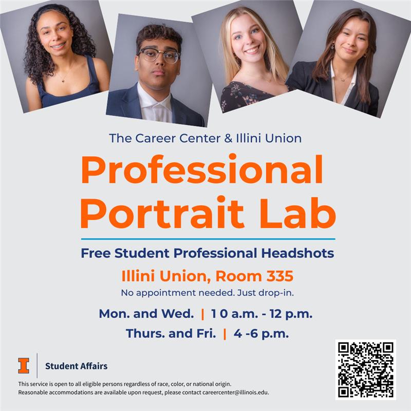 Free student professional headshots offered at the Illini Union. No appointment required. Click below to learn more.